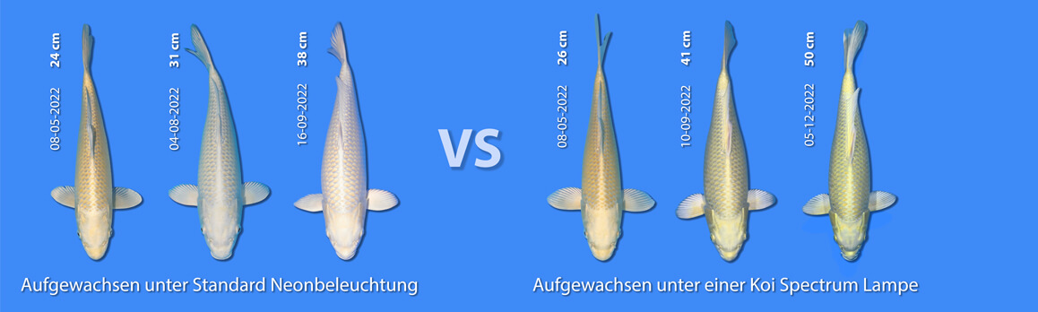 Ein überdeutlicher Beispiel in de Unterschied zwischen einer standard benutzte Beleuchtung und der Koi Spectrum Lampe sind diese zwei Yoshikigoi Yamabuki. Sie sind gleich alt und aus der gleichen Zucht. Der eine Fisch ist aufgewachsen in einem Innenbehälter mit Neonlicht, der Andere in einem Innenbehälter mit einer Koi Spectrum Lampe. Das Ergebnis spricht für sich.